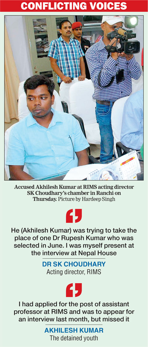 "He (Akhilesh) was trying to take the place of one Dr Rupesh Kumar who was selected in June. I was myself present at the interview at Nepal House. This man (Akhilesh) I saw in the hospital (RIMS) on a couple of occasions with Dr Hemant Narayan (head of cardiology). My suspicions (that he is an imposter) were confirmed when he could not produce his joining letter and said he had left it at his nana's (grandfather's) house in Ashok Nagar (Ranchi)," Choudhary said.
