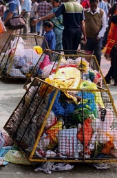 | School students collect plastic bags as part of an awareness campaign. Plastic waste might soon be used in the construction of roads |