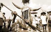 | Tribals of Jharkhand wear their traditional headgear made up of bull?s horns while performing a dance ritual in Ranchi. The settlers are in the midst of a leadership vacuum after a ruling by the high court. Picture by Prashant Mitra |
