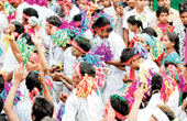 Ranchi, April 13: The festive mood was in the air as major thoroughfares of Ranchi were adorned with red and white flags, decked-up akharas and youngsters dancing to the beats of nagara, mandar and flute on the occasion of Sarhul today.
