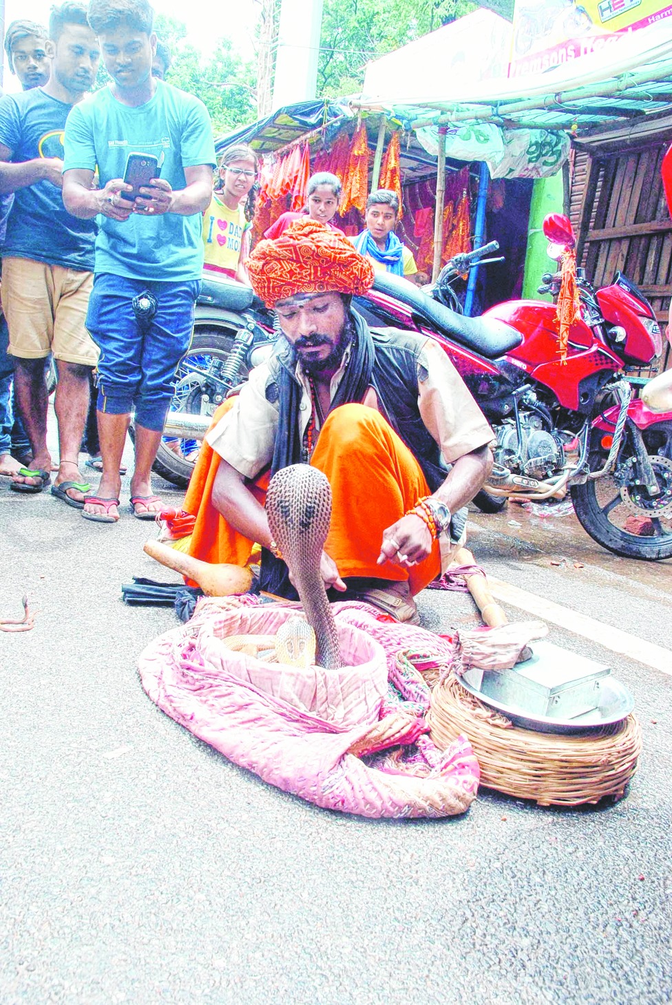On Sunday, a dozen snake charmers from Kanpur thronged the entrance gates of Pahari Mandir at the foot of Ranchi Hill with cobras, pythons, kraits and other reptile species, attracting thousands of devotees and onlookers.