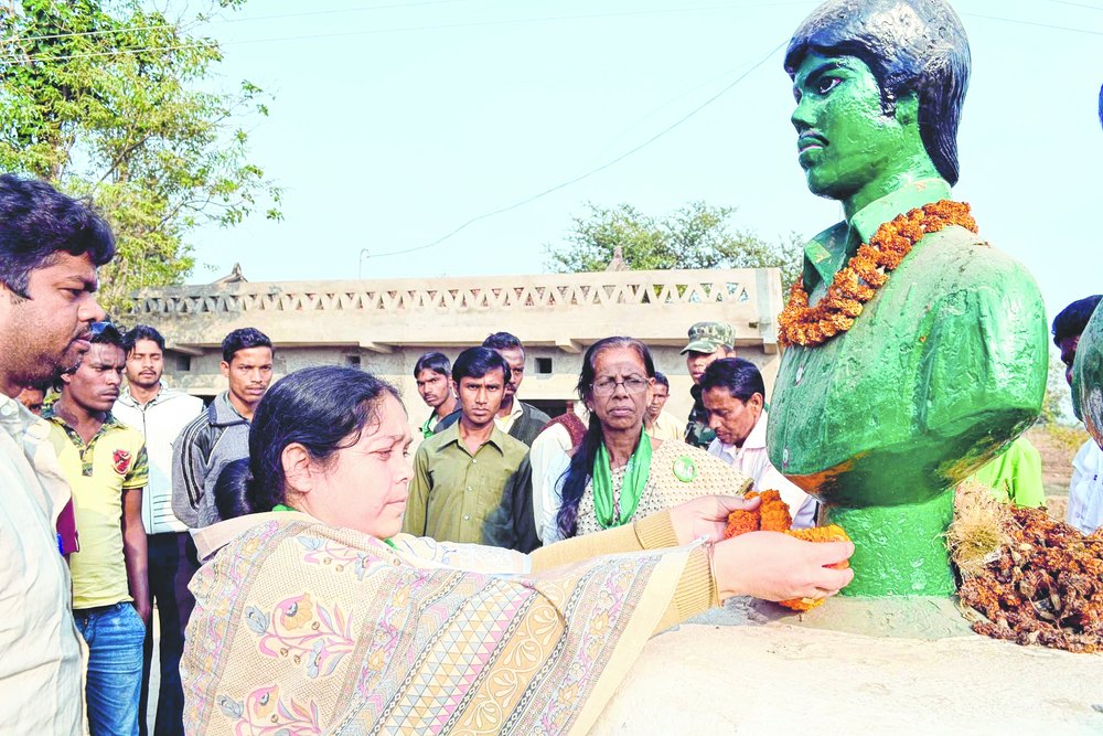 Sabita Mahto garlands the bust of statehood martyr Dhananjay Mahto at Shahid Chowk in Khukhru block, Ichagarh, on Friday. Picture by Animesh Sengupta