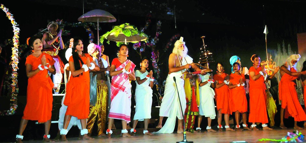 The stage accessories such as bamboo umbrellas and baskets and the actors' costumes coupled with their dialect reflected the culture of the tribal population of the state.