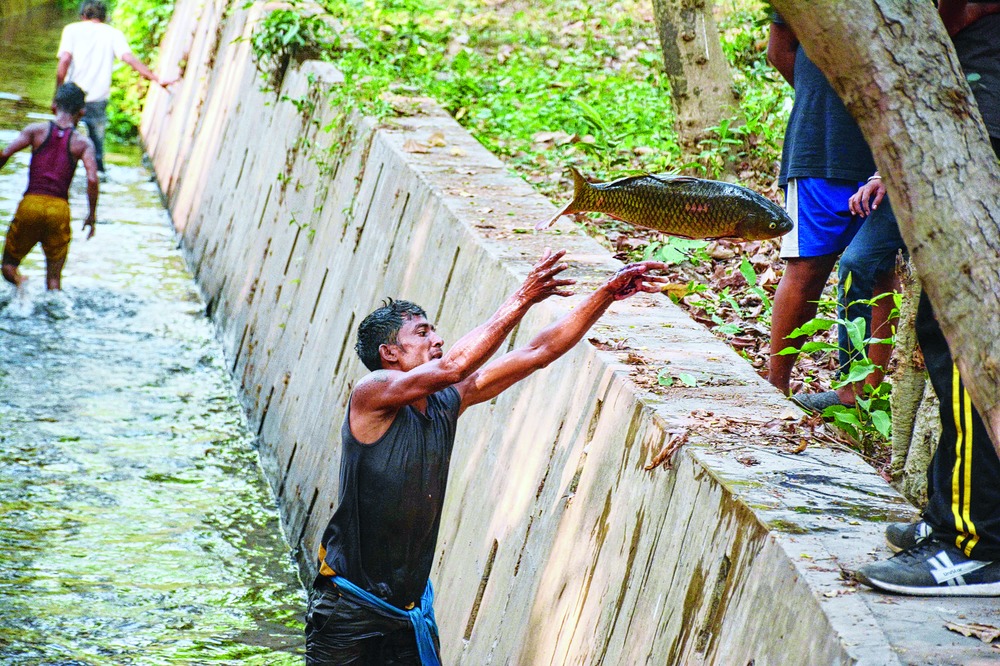 As soon as the fish started swimming into the drain in vain hope of survival, morning walkers, groggy residents and commuters began netting them with T-shirts, plastic bags or anything else they could find handy. Some overzealous youths even dived into the drain while others fetched and spread nets. The loot began around 7am and continued for well over an hour till not a fry was left.