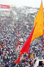 Swords, spears and lathis clashed in mock fights as the devotees danced down the streets and made their way to the popular temple at Doranda, Tapovan Mandir. Deafening beats of the drums, the banjo and the relentless music blared through loudspeakers combined to create a frenzy.