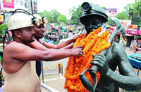 Miners offer tribute to the landmark statue of a labourer at Shramik Chowk in Dhanbad (picture on top), members of Jharkhand General Kamgar Union stage demonstrations before Raj Bhavan in Ranchi (above left) and state food and civil supplies minister Saryu Roy felicitates masons and construction workers at Michael John Auditorium in Jamshedpur on International Labour Day on Monday. Popularly called May Day, the day that celebrates labour and labourers also saw over 150 workers from Lohardaga and Gumla protesting before Raj Bhavan. Their prominent demands included permanent jobs for all who gave up their land for Hindalco's bauxite mining project, lesser use of machines to generate more jobs and basic amenities for people in mining areas. Pictures by Gautam Dey, Prashant Mitra and Bhola Prasad