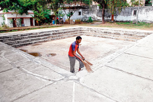 | A worker cleans the cement-concrete talab on the temple premises in Ashok Nagar, Ranchi, on Monday for Chhath. Picture by Hardeep Singh |