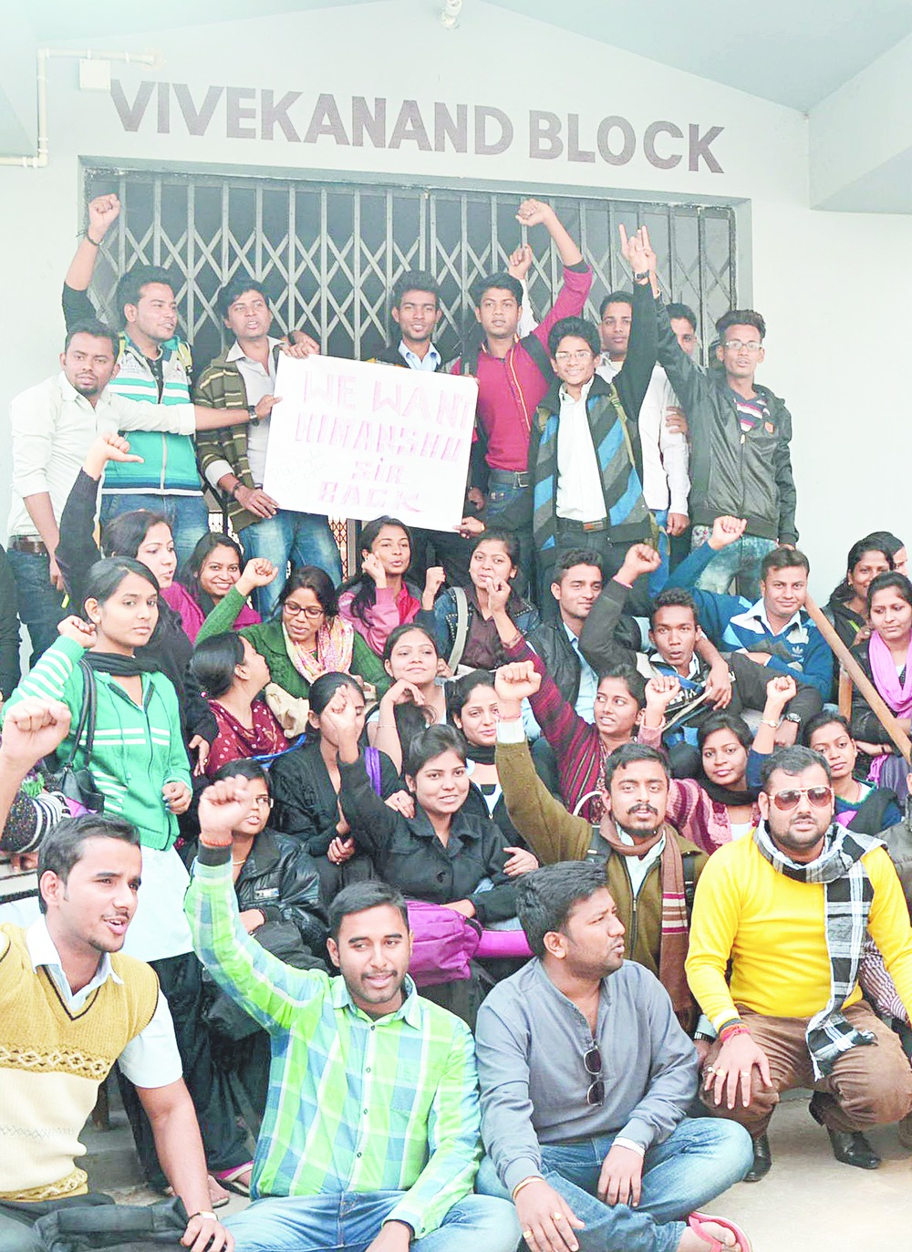 Carrying placards and raising slogans, they gathered in front of Vivekanand Block of the college's administrative building at 11am. The students demanded immediate revocation of the transfer order issued to English professor Himanshu Shekhar Chaudhary and physics professor D.K. Giri on January 3 and even threatened to launch a massive protest at VBU headquarters after January 9.