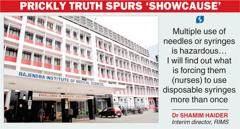 In a shameful rerun of malpractices at Rajendra Institute of Medical Sciences (RIMS), nurses at the medicine ward of the state-run hospital were caught red-handed reusing hypodermic syringes on Thursday, spurring a showcause tizzy but no practical endeavour to stop a possible nexus of employees and outsiders that smuggles out medical kits meant for underprivileged patients.