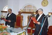 | Chief Justice Nelavoy Dhinakar (left) administers oath of office and secrecy to newly-appointed high court judge Permod Kohli in Ranchi. Picture by Hardeep Singh |