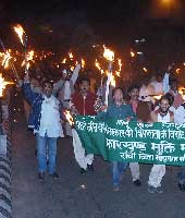 | Jharkhand Mukti Morcha activists take out a “torch-light” procession against the statehood celebrations in Ranchi. Picture by Hardeep Singh |