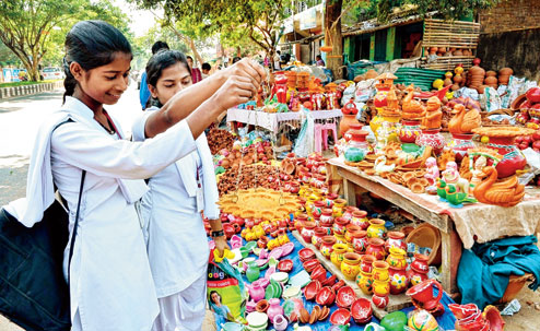 | Two schoolgirls admire earthen diyas at a stall near Harmu Bypass in Ranchi on Tuesday. Picture by Prashant Mitra |