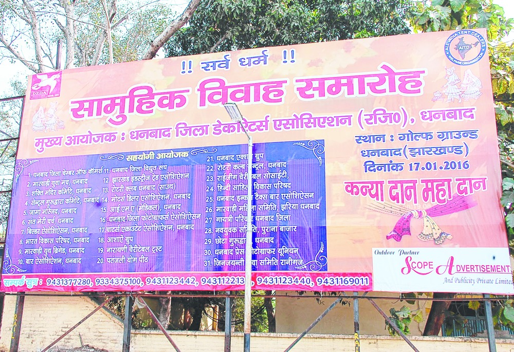 This free-of-cost, multi-religious mass marriage function, scheduled at Golf Ground, is being hosted by Dhanbad Zilla Decorators' Association, an outfit of over 2,000 tent house operators, with the help of 34 other organisations, at a cost of around Rs 30 lakh.