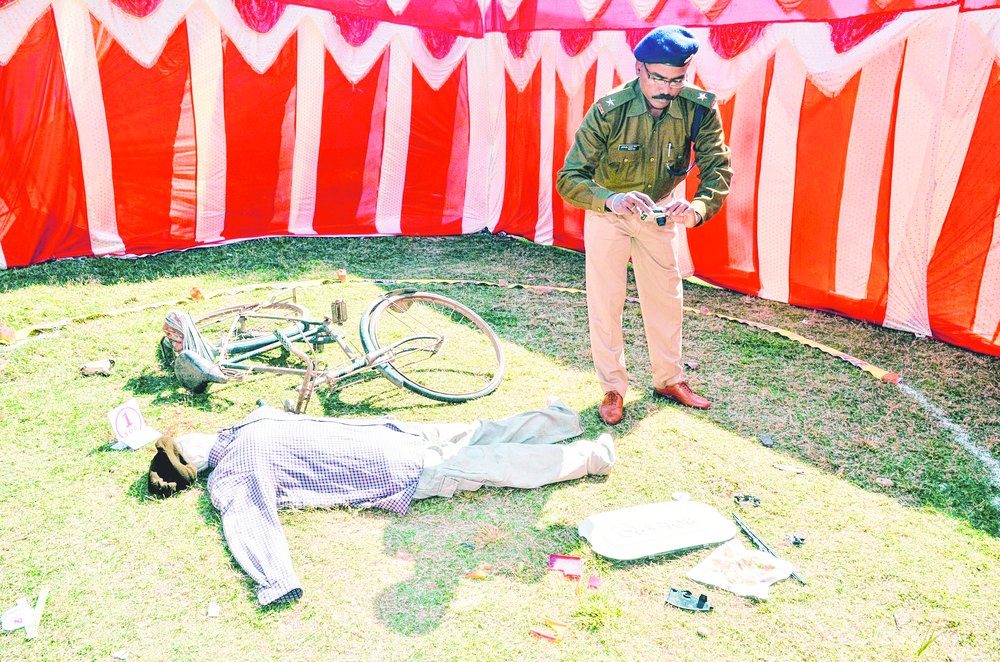 A policeman takes photographs of a mock crime scene at the ongoing meet in Ranchi on Friday. Picture by Prashant Mitra