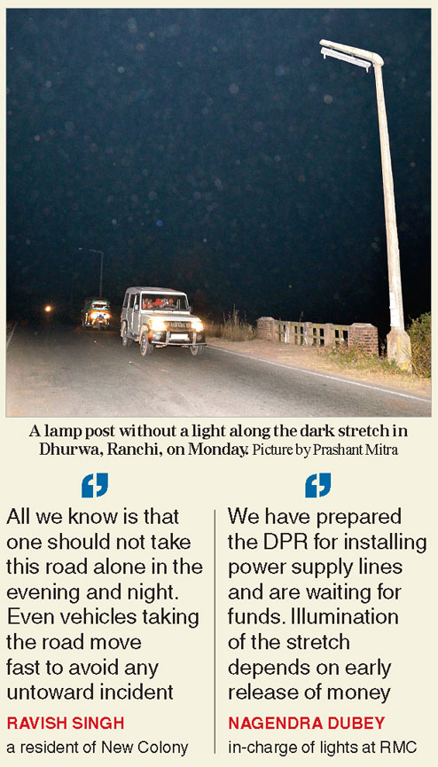 The one-and-a-half-km road from Dhurwa Golchakkar to Babu Veer Kunwar Singh Chowk, which leads to New Colony and Hatia Dam, plunges into darkness every evening in the absence of street lights even though there are as many as 30 poles.