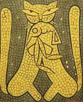 Jamini Roy’s paintings ? which would be better appreciated if grouped together? recall the master’s enduring themes: cat with lobster, Jesus, man with an Indian drum and so forth. Devotees can enjoy at leisure their breathtaking linear simplicity and the raw, opaque earth colours, limited though their spectrum is.