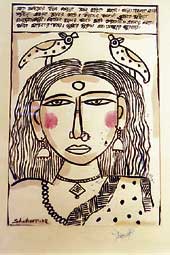 Sceptics would scoff, but to gaze at one of Nasreen Begum’s paintings was to breathe the balmy air of grambangla. With neither titles nor numbers attached to the frames, you could not be more specific, but this particular work, a kind of faded mirage of village life, had a persuasive Bengaliness that was yet shorn of limp sentimentalism. Which came as much from the theme as from the thin, broad sweeps of paint that recalled the tradition of wash. A range of browns imported a fey evanescence, underlined by a visual riff that recurred in her other works: Falling Leaves, which brought to mind Tagore’s Jharapata Go. The Bengali identity was, however, proclaimed more literally in the works of Quamrul Hassan whose fluent lines and brevity of form went back to the dialect of pat. Aminul Islam’s mixed media works approximated aerial prints with a tangle of black lines scarring the centre of a palely tinted ground. The droll spirit of child art infected Shamarjit Roy Chowdhury like it does many artists here, while the elegance of the Bengali script counterpointed the wry simplification of form in Abdus Shakoor.