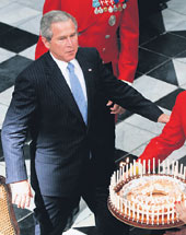 | President George W. Bush jokingly stumbles before his birthday cake before blowing out all the candles at the Fredensborg Palace in Denmark on Wednesday. The cake was presented to him by Denmark’s Queen Margrethe on his 59th birthday, which he spent in the Danish capital Copenhagen before preparing to fly to Scotland for the G8 summit. (Reuters) |
