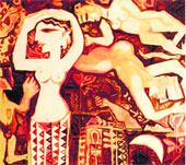 Four of his works are on view ?an ink drawing of wild horses, two early watercolours of a stained glass interior and ritual bathers in a stream and a gouache painting of the Cathedral with flowering trees in spring. These remind one of the aesthetic adventures of the 1950s and 60s. Bijan Choudhury’s painting of the series on cavalry charge is also on display. Robin Mondal has mellowed much with age. His two muralesque paintings of woman and children in a queue during a festival executed in a happy mood, while his two miniature of an agonised face revive memories of the angry Rabin of yesteryears. Gopal Sanyal’s paintings of folk toy sellers and women singing a classical raga are stylised and subdued.