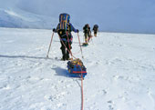 The glacier is 72 km long and the ascent is gradual but the going was tiring because of the snow, which made skiing and dragging sleds difficult. It would get very hot on the glacier in the day and the snow underfoot would turn to slush. We wore skins on our skis to prevent backward sliding and this made movement on slushy snow more difficult. We would cover about 14-18 km a day.