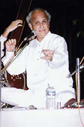While the distinctly diverse shades of the common re–ma combination of these three evening ragas painted separate moods, the inimitable splendour of the oscillating re-dha of Bhairav, rarely heard these days, automatically etched the scenic piety of the dawn. The maestro, splendidly aided by Gopal Misra and Jyoti Goho on the tabla and harmonium respectively, sang E prabhu daata invoking God. One could not help visualising an open cyclorama with a hint of pink at this point. Imaginative light effect displaying meditation being titillated by seductive spring during the superb rendition of Bhairav Bahar and that of rain during Miyan Malhar could have done wonders.
