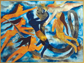 Shah fuses the ritualistic tribal designs into today?s living folk spirit, the earth pigments used being evocative of the mythological locales like Mathura and Vrindavan. His elongated figurations seem, moreover, to lend a vertical, if also ennobling mien, to the habitues of the idyllic milieu he creates with a mellow romantic touch. This is one area where tradition and modernity interpenetrate.