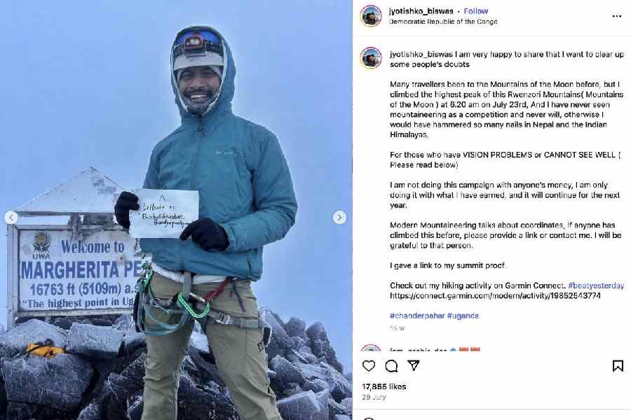 Jyotishko found his Alvarez in his guide Benard, a member of the Bakonzo tribe inhabiting the Rwenzori foothills. “He had such an easy familiarity with the trees and birds!” he recalls. It was in his company that he scaled Margherita Peak on July 23.