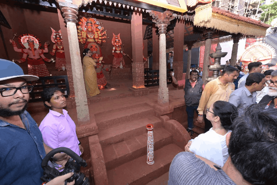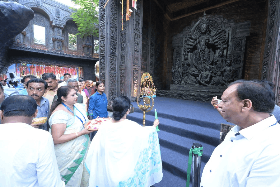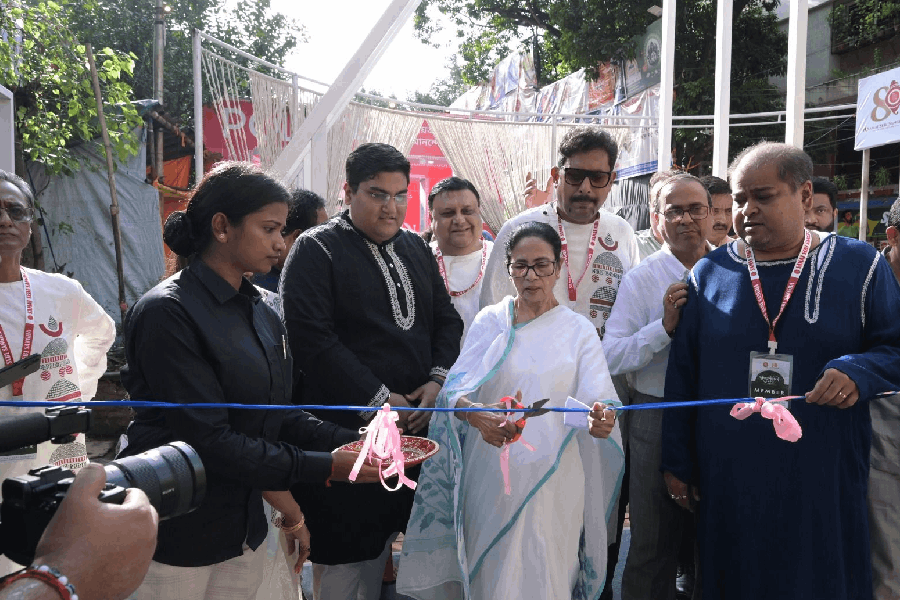 Next on the chief minister’s inauguration itinerary was Kalighat’s 66 Pally, where this year’s Durga Puja theme is Shaad Kahan. The pandal, designed entirely with spices, traces their journey through history — from bustling markets and traditional grinding practices to their transportation across seas and land over the centuries.