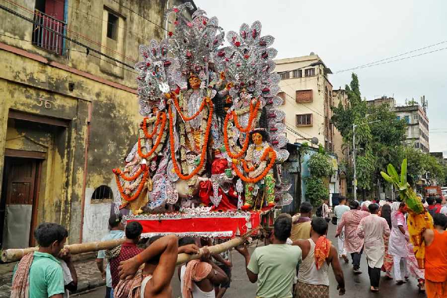 From family pujas in old neighbourhoods to small para committees, most idols are carried in processions through the streets before heading to the ghats for immersion.