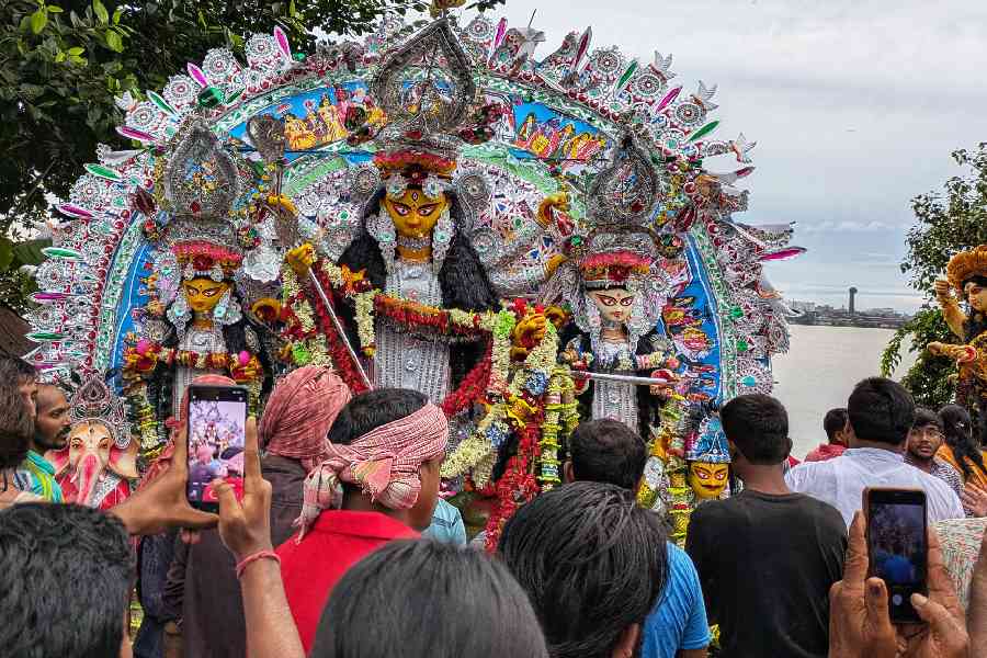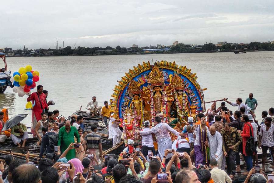 Families and neighbours gather, some singing and dancing to the beat of the dhaak, while others walk silently, their eyes moist at the departure of the goddess.