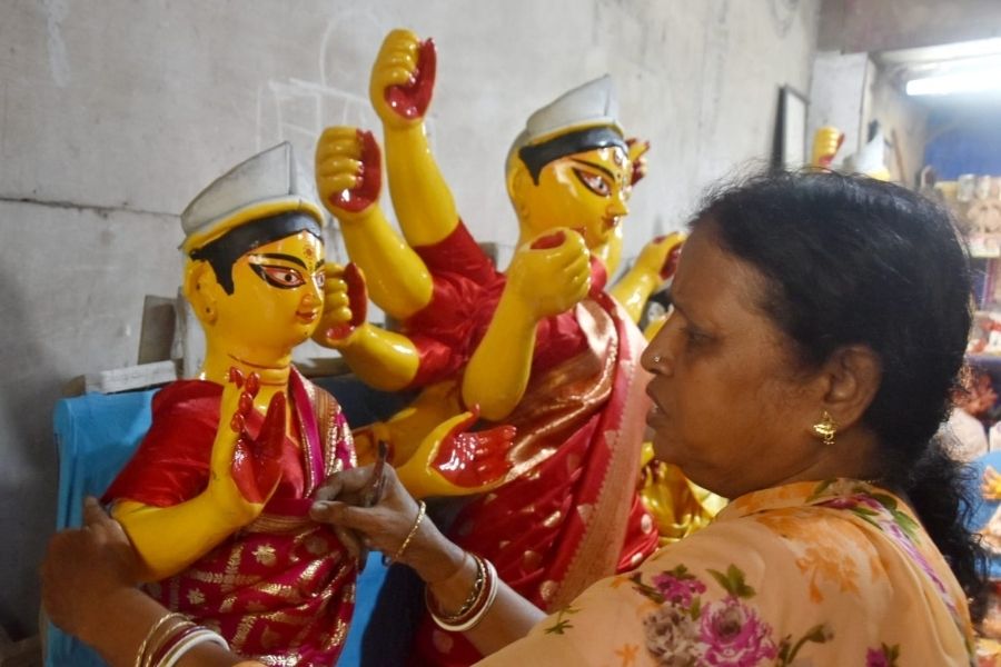 “Jani na bhogoban keno shashti dichhe (don’t know why God is punishing us),” said idol maker Mala Pal, as she repaired a damaged Durga idol in her studio on Tuesday. The alleys of Kumartuli were still wet after heavy rain lashed Kolkata on Dwitiya morning, leaving the city waterlogged and paralysed.