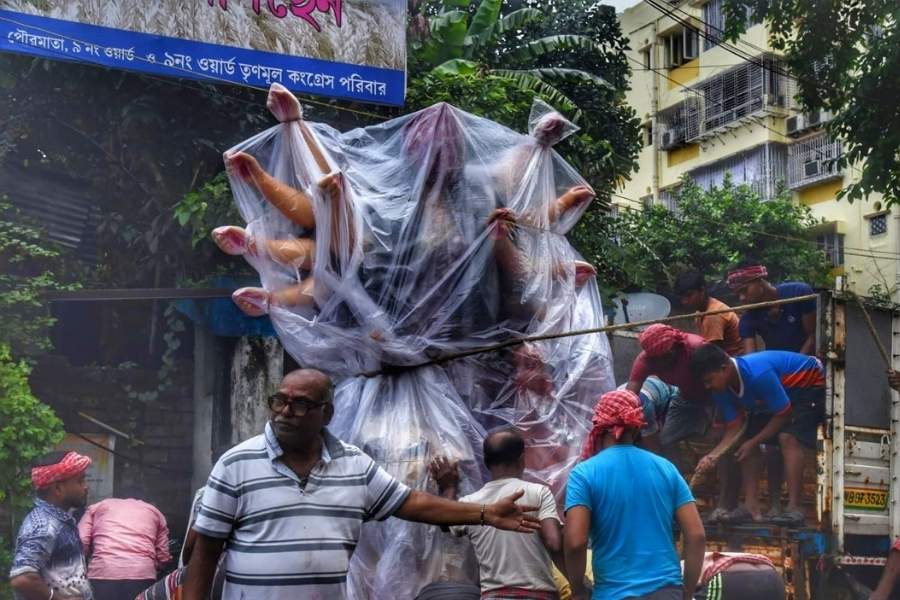 Kartick Pal, secretary of Kumartuli Mrit Shilpi Samiti, said deliveries were stalled through Tuesday morning. “We have asked customers not to come today. There are no coolies. There is water everywhere,” he said. Some idol makers managed to send off idols late Monday night wrapped in plastic sheets, but once the water entered the lanes, everything came to a standstill.
