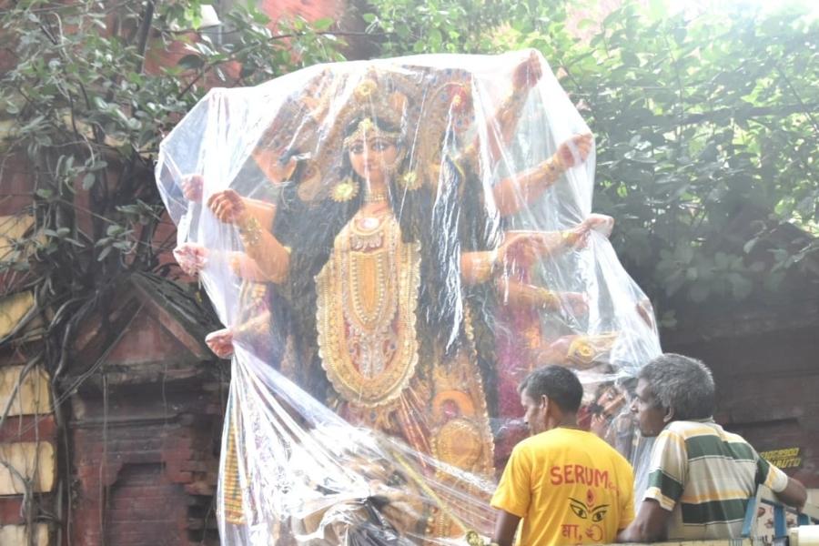 With Shasthi just five days away and Bodhon rituals scheduled soon, Kumartuli is in a last-minute rush to make up for lost hours. The looming forecast of more rain in south Bengal has left idol makers anxious, hoping that the weather will hold so that every idol reaches its destination on time.