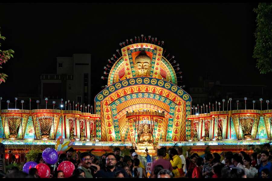 A dazzling view of the Garia Srirampur Kalyan Samity Puja Pandal inspired by Buddhist motifs.