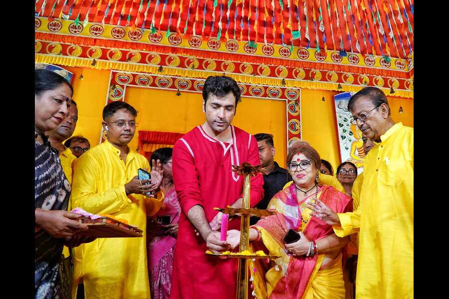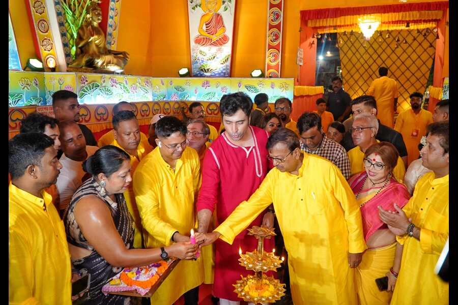 Abir Chatterjee lights the candle alongside organisers, marking the beginning of festivities.