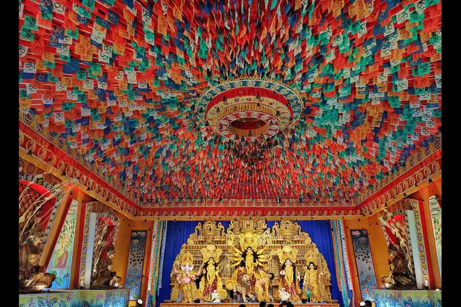 A breathtaking canopy of colourful prayer flags sets the backdrop for the majestic Durga idol.