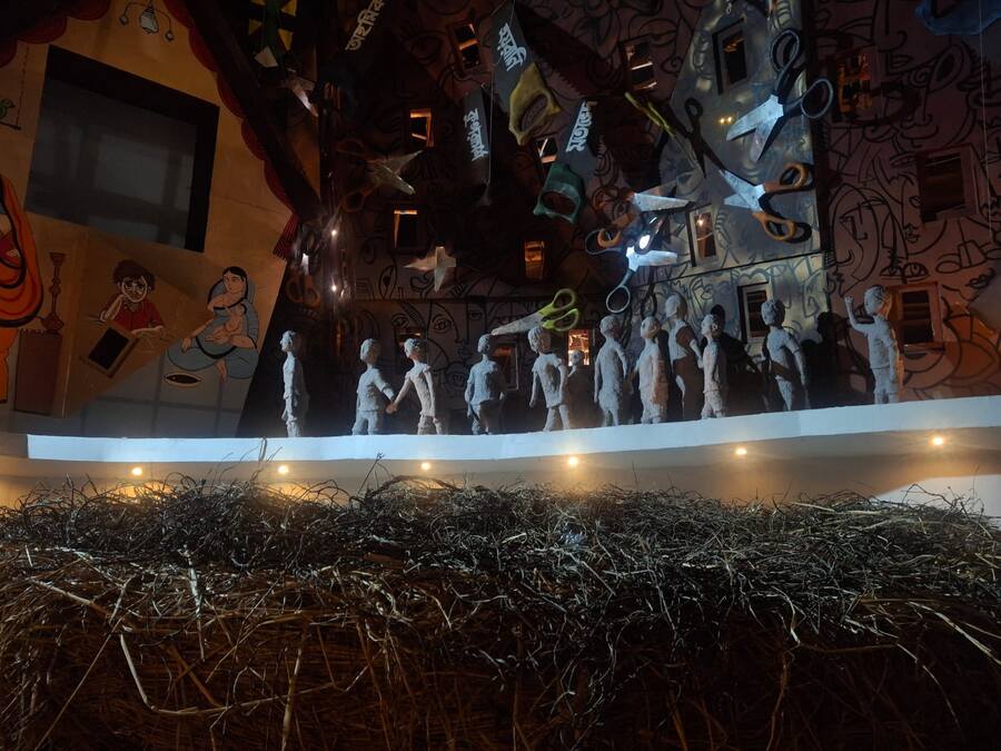 The pandal design reflects this turmoil. The walls are lined with saw blades, each etched with reasons for relationship breakdowns such as ego clashes, jealousy, infidelity and domestic violence. Between the blades, children are depicted marching with placards, one reading, “What is our fault?” Scissors jut out from the walls, symbolising division, while a sewing machine stands as a hopeful emblem of mending bonds.