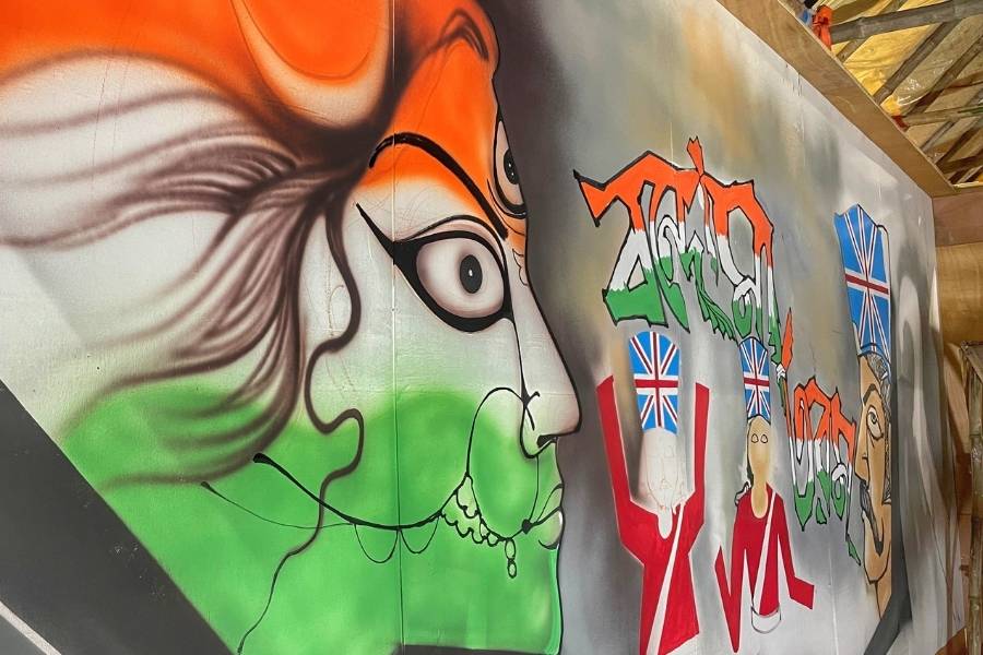 Dakshinpara Yuba Parishad in Dumdum commemorates Bonde Mataram Der Sho Bochhor Udyapon, with artwork by Arijit Ambuli.