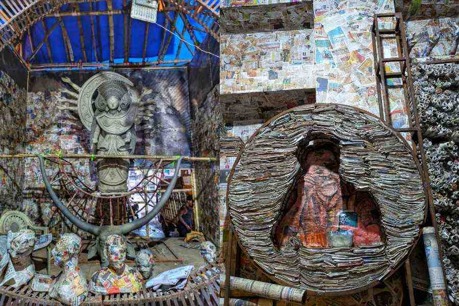 Sreepalli Welfare Association in Laketown showcases Nobikaron (Idol made of 10 lakh newspapers), conceptualised by artist Tanmoy Hazra.