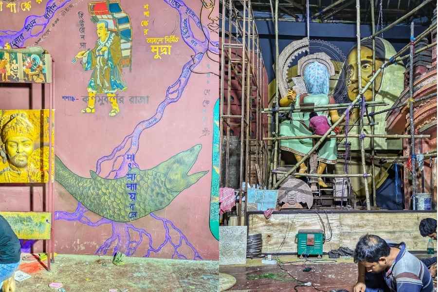Ashwininagar Bandhumahal Club highlights the theme Bangla O Bangali, presented by artists Pintu Sikdar and Samrat Bhattacharya.