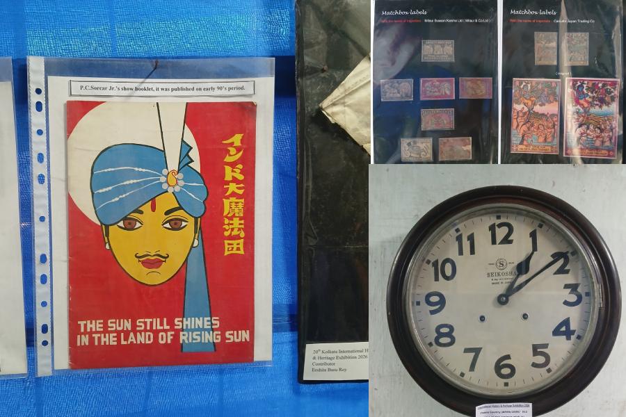 A display of memorabilia of cultural relations with Japan featuring Rabindranath Tagore, Netaji Subhas Chandra Bose, and P.C. Sorcar.