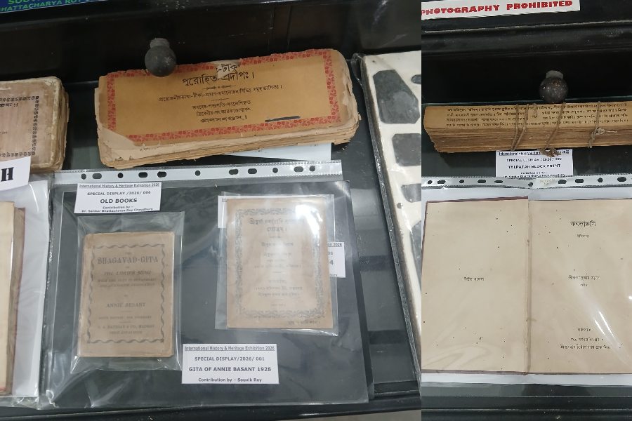 On display are century-old books, printing materials from the collection of Souvik Roy. This section also features the Gita that Annie Besant used personally.
