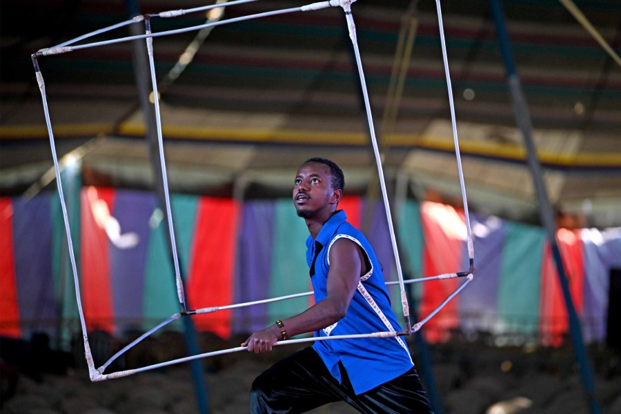 Circus attendees cheered for an Ethiopian acrobat who performed with a large cube-shaped apparatus as part of a ground act.