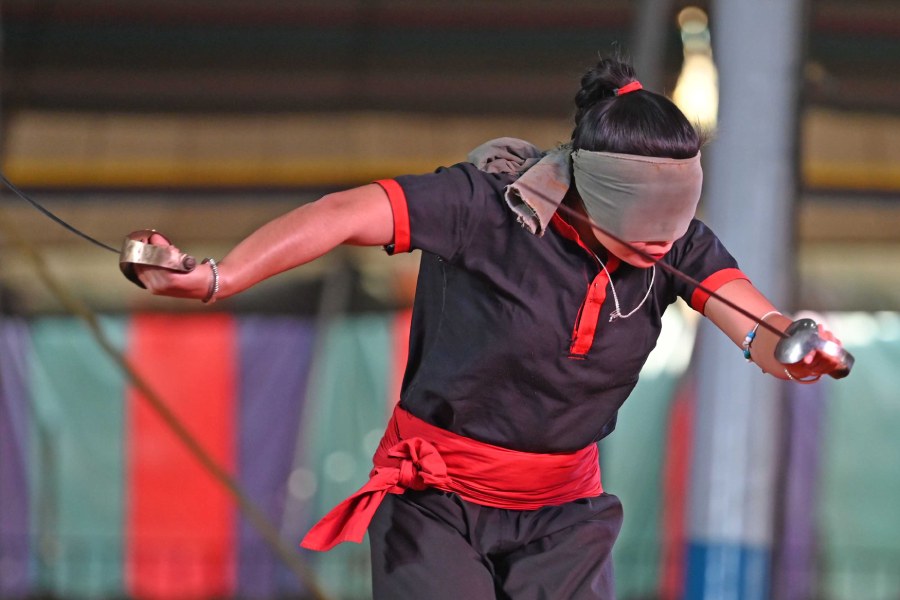 Not ninjas or swordsmen, a Manipuri woman wielded swords and chopped fruits on others’ hands wearing a blindfold.