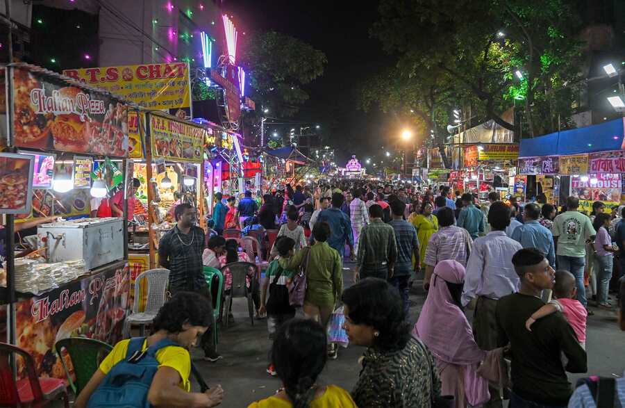 Kolkata’s streets are overflowing with pandal-hoppers as Kali Puja and Diwali celebrations merge into one grand spectacle, with food stalls, lights and music drawing thousands.