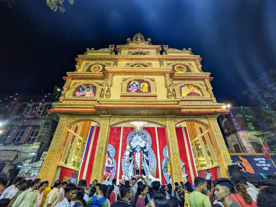 The Amherst Street Kali Puja pandal dazzles in gold, glowing under the night sky