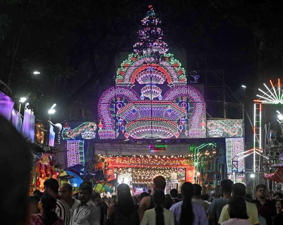 An avenue of dazzling neon lights creates a carnival of colour at the entrance. The Amherst Sadharan Puja Committee turns the street into a glowing tunnel.