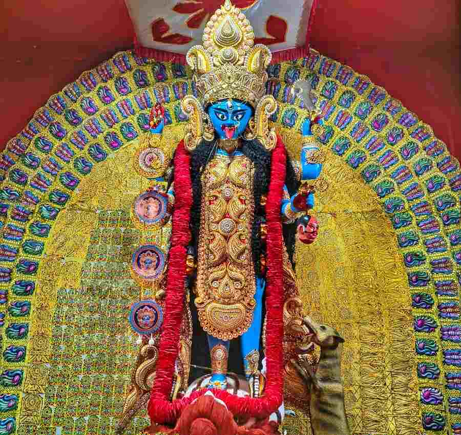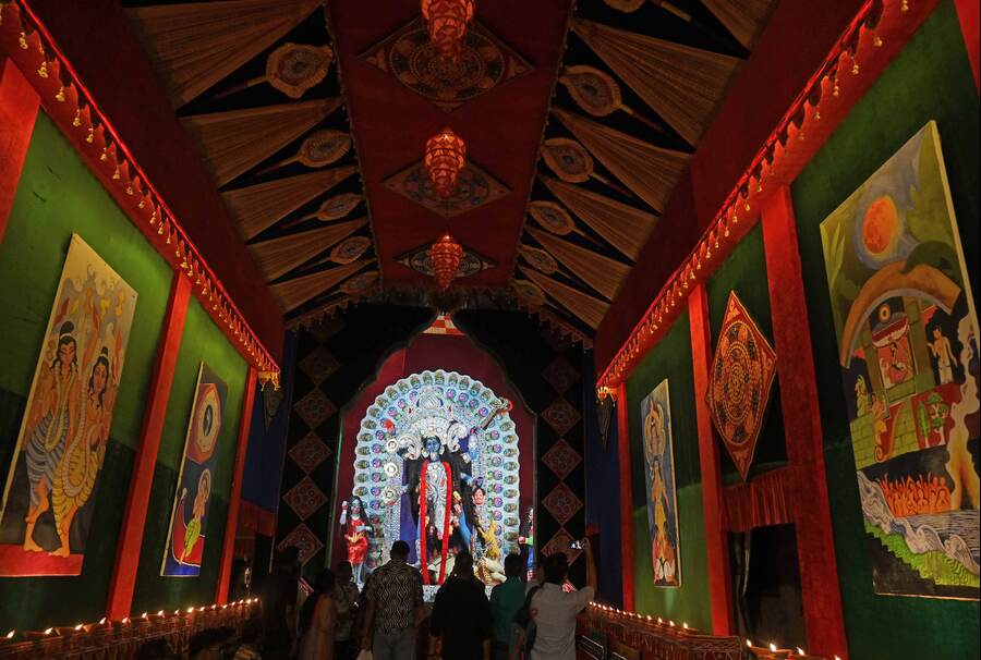 Jamapukur Club blends folk art and faith through hand-painted walls and motifs. Inside, Maa Kali stands in a warm, traditional ambience.