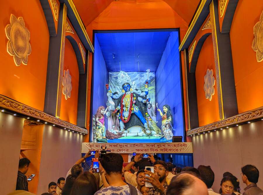 Orange and blue lights frame Maa Kali in an intense, dramatic setting. Visitors pause mid-walk to capture the striking idol at Fata Kesto’s pandal.