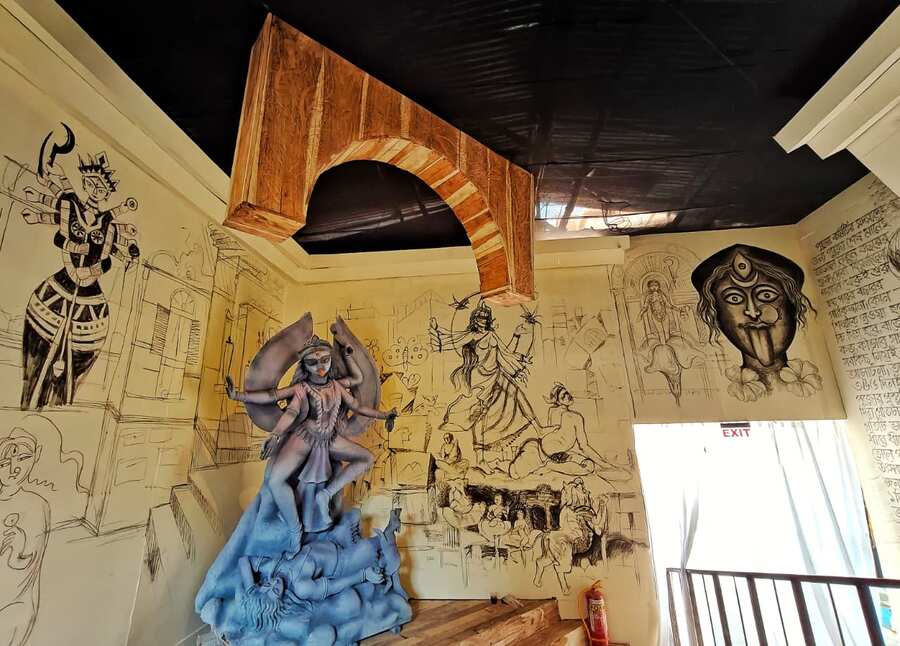 Bijoygarh 6 Pally showcases raw creativity with murals, sketches and sculpture. The unfinished aesthetic adds an artistic edge to devotion and storytelling.